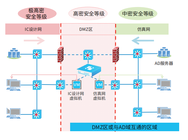 集成電路行業為了保護內部的核心數據和安全考慮,一般采用物理隔離或通過防火墻將內部網絡進行隔離,隔離了多個網絡,其中包括辦公網、生產網、設計網、仿真網等。網絡隔離后,由于業務需要,不同網絡及部門之間均存在頻繁的互相發送文本文件(如.csv、.doc、.excle等)、設計文件(如.scs、.pof、sof等)、代碼文件(如.lib、drf、cpp、java等)等核心數據。
