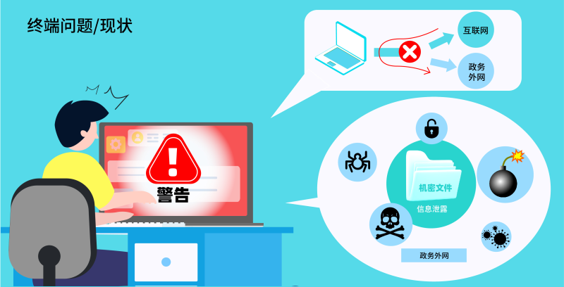 當前,部分政務部門已完成終端安全建設,但終端安全技術路線未統一,安全效果強弱不一,無法保障安全與使用相結合。同時,傳統防護方式針對終端側數據落地缺乏保障,基本對內部完全信任不設防,對導入導出等泄露政務外網敏感數據的行為缺乏有效管控,數據泄密事件頻發。