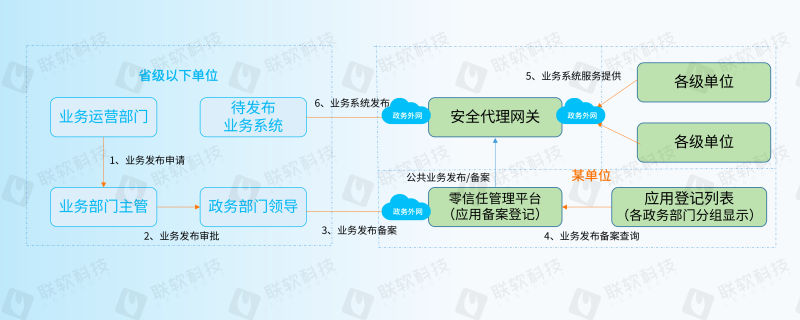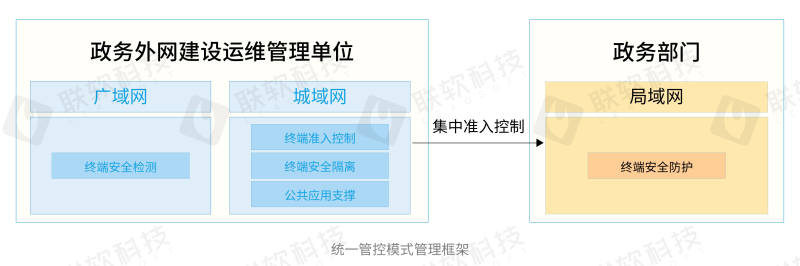 按照“全盤統籌、多級部署、分層管控、屬地管理”的原則,根據政務外網業務是否集中部署的場景,聯軟推出兩種政務外網終端“一機兩用”安全管控方案: