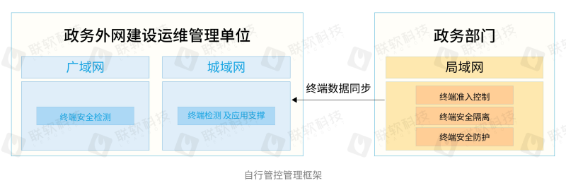 自行管控模式管理框架包括:負責終端安全防護,包括終端準入控制、終端安全隔離和終端安全防護;在城域網邊界實施終端檢測、應用支撐和安全集中監控,在廣域網邊界實施終端安全檢測;將終端管控相關管理數據同步給所在層級的政務外網建設運維管理單位。