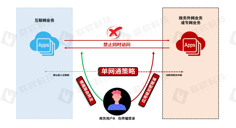 網絡隔離:聯軟的“一機兩用”政務外網終端管控方案,打破“一機多用”現狀,對接入政務外網終端實現網絡隔離,實現同一臺終端無法同時訪問兩張網絡,如終端在訪問互聯網時,無法訪問政務外網。當此終端訪問政務外網時,無法訪問互聯網。