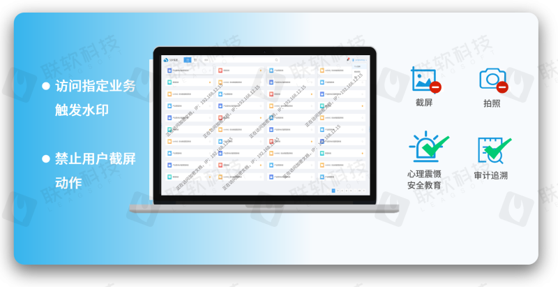 追蹤溯源:考慮到用戶拍照等泄密行為,對于重要的業務數據或特殊政務外網業務系統,可采用屏幕水印技術,防止拍照后無法溯源,同時也可對終端用戶啟動心理震懾作用。支持多種專利水印技術,可支持移動終端和PC終端屏幕顯示。