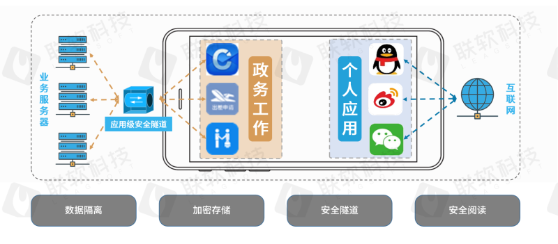 移動安全:采用“零信任”安全架構設計理念,為移動終端用戶提供業務應用的安全訪問,通過數據隔離、加密隧道以及加密存儲等機制保障業務App的運行安全與數據安全。