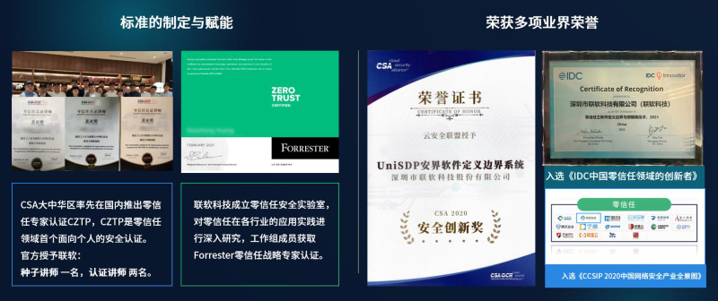憑借在零信任領(lǐng)域,領(lǐng)先的研發(fā)創(chuàng)新能力和成功的落地實(shí)踐,聯(lián)軟也成為了多項(xiàng)國(guó)內(nèi)零信任標(biāo)準(zhǔn)的制定者,擁有多名CSA首批零信任認(rèn)證講師、 Forrester認(rèn)證的零信任戰(zhàn)略專家、入選《IDC中國(guó)零信任領(lǐng)域的創(chuàng)新者》,UniSDP零信任訪問(wèn)控制系統(tǒng)(即UniSDP安界軟件定義邊界系統(tǒng))榮獲“CSA 2020安全創(chuàng)新獎(jiǎng)”,全產(chǎn)品線入圍CCSIP的全景圖。