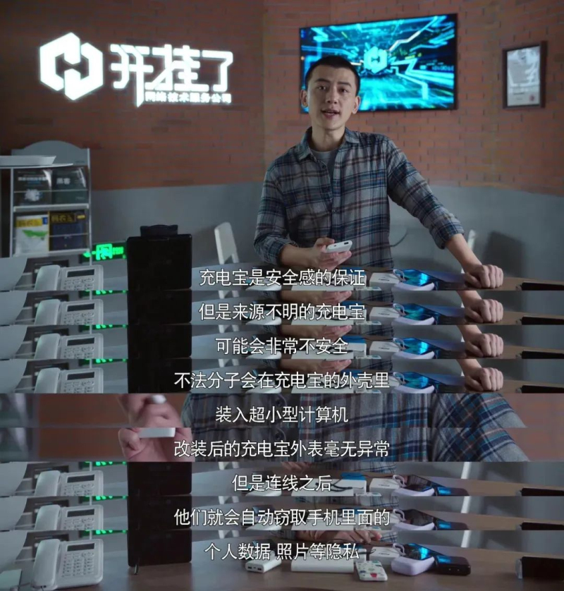 其中,對于個人信息泄露,《你安全嗎?》劇中展現了幾個非常典型的場景。劇中第一集就展示了在公共場所使用來源不明的充電寶有被竊取數據的風險,威脅個人信息安全。