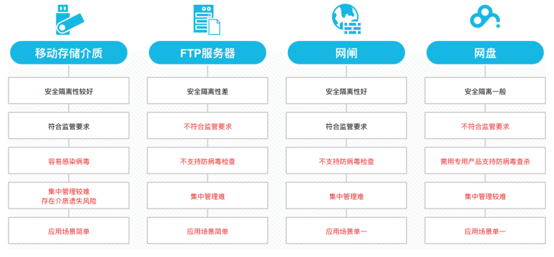 對比網絡共享、FTP、U盤等傳統方案,聯軟安渡UniNXG安全數據交換系統,提供高效文件跨網上傳下載分享,并可實現數據防泄漏、病毒木馬查殺、文檔交換行為審計,文件交換審批等能力。