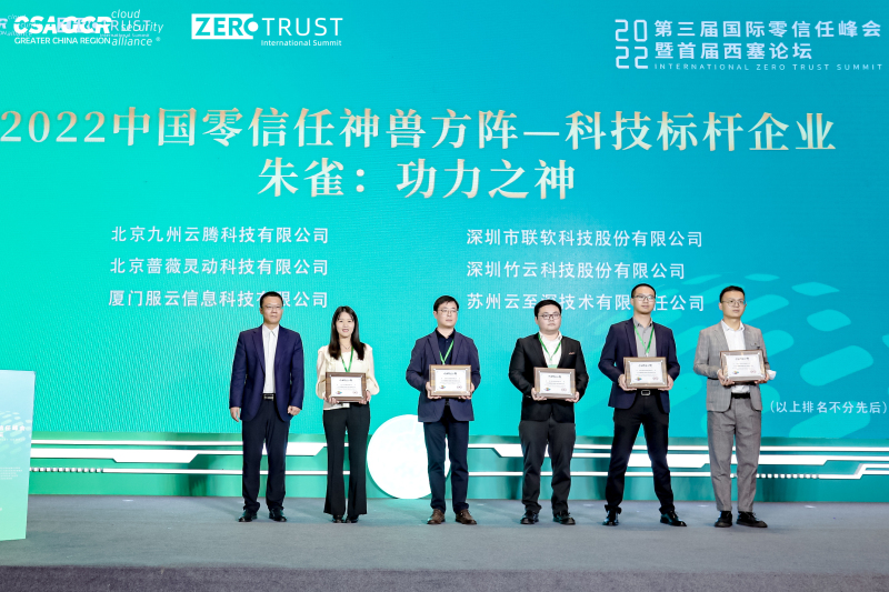 ▲聯軟榮獲2022中國零信任神獸方陣-科技標桿企業稱號,位居“朱雀-功力之神”(右二)