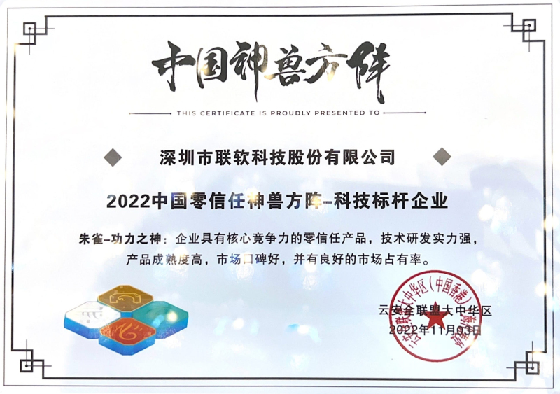 ▲聯軟榮獲2022中國零信任神獸方陣-科技標桿企業稱號,入選朱雀方陣