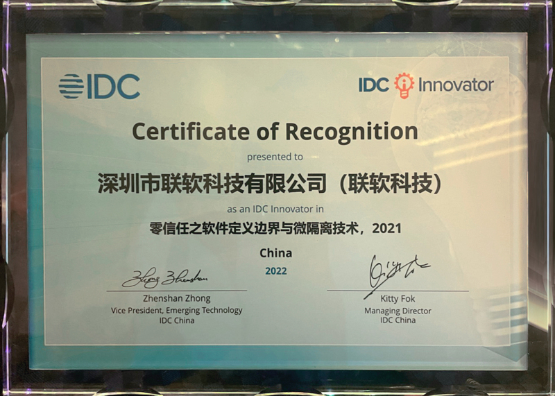 在零信任安全領域,聯軟屢次斬獲業界重磅榮譽。不久前,聯軟科技憑借在零信任領域,領先的研發創新能力和成功的落地實踐,成功入選《IDC創新者:零信任之軟件定義邊界與微隔離技術,2021》報告,榮獲零信任領域“IDC Innovator”榮譽證書。