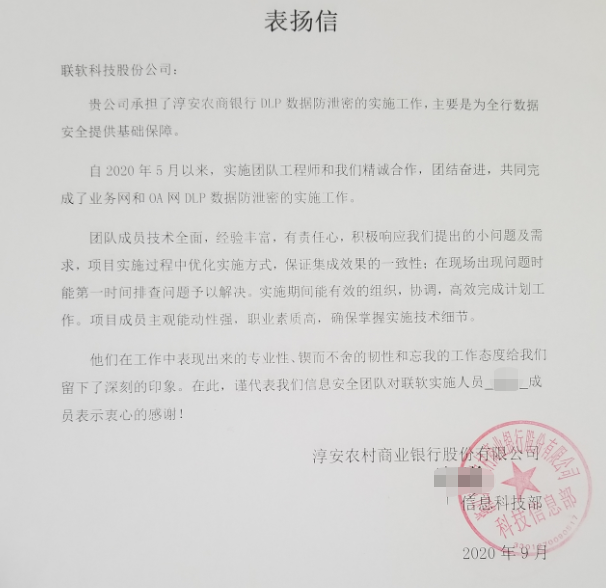 對(duì)于淳安農(nóng)商行發(fā)來的感謝信,聯(lián)軟科技感到十分的榮幸,并感謝相關(guān)部門同事在此次項(xiàng)目實(shí)施過程當(dāng)中給予的各方面支持。
