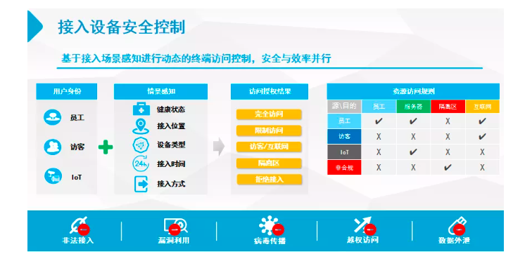 聯軟準入控制基于場景化的方案,能夠滿足不同接入環境的準入控制要求, 針對有線接入、無線接入、內部員工、訪客、PC端和手機端,以及不同人員的所屬部門和權限來采用靈活的準入控制方式。