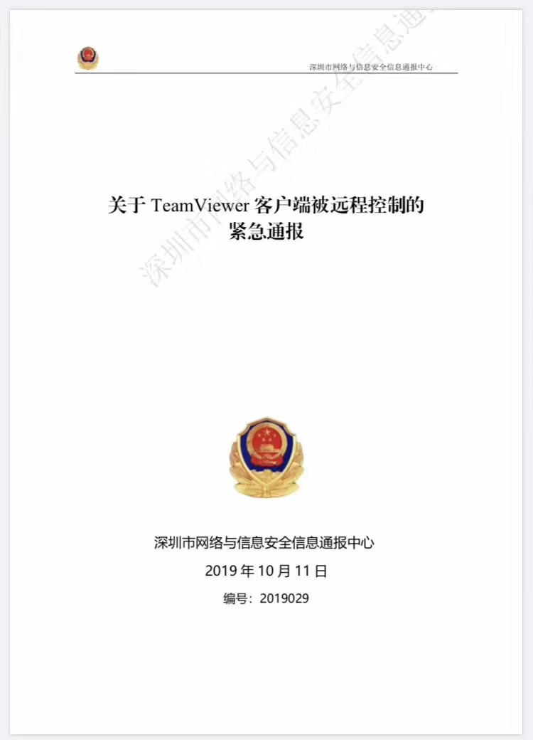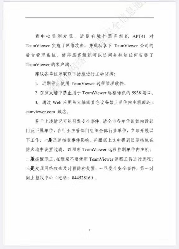 10月11日,深圳市網絡與信息安全信息通報中心發出關于 TeamViewer 客戶端被遠程控制的緊急通報,指出目前知名遠程辦公工具 TeamViewer 已經被境外黑客組織 APT41 攻破,提醒企業組織做好防護措施。