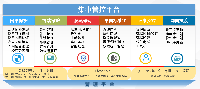 系統內置準入網關控制器組件,通過管理授權可自由擴展數據防泄露、移動終端安全管理、殺毒管理等模塊。還可集中管控平臺,將產品集中在一個平臺上,一個客戶端就能解決所有需求。