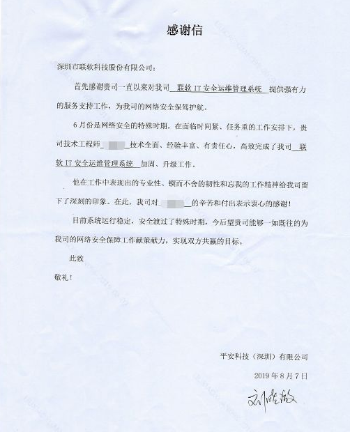 對于平安科技(深圳)有限公司發來的感謝信,聯軟科技也感到十分的榮幸,并感謝平安科技(深圳)有限公司相關部門同事在此次項目實施過程當中給予的各方面支持。