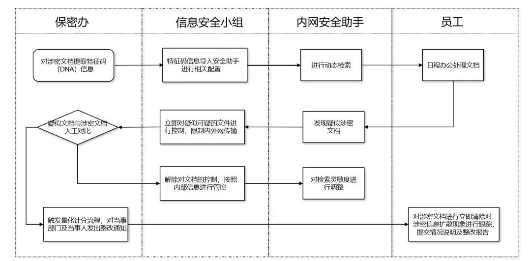 ●流程可控:利用安全助手,可對非密網(wǎng)絡(luò)中疑似涉密文檔做到精準(zhǔn)掌控,從信息處理的各個節(jié)點有效保護涉密信息的安全可控,對違規(guī)行為做到“早發(fā)現(xiàn)、早處置、早補救”,最大程度避免失泄密事件的發(fā)生。