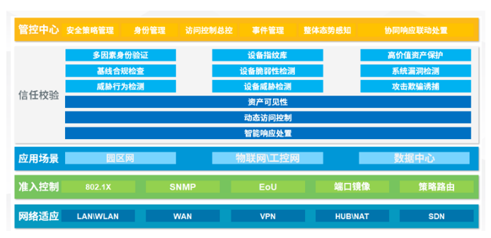 在網絡適應上,通過一套系統實現多種網絡環境下的準入管理和動態授權,包括交換機有線接入、無線接入、還有HUB接入、nat接入、vpn接入等場景,并可針對不同場景下實行不同的網絡授權體系,實現端口級別的準入管控。
