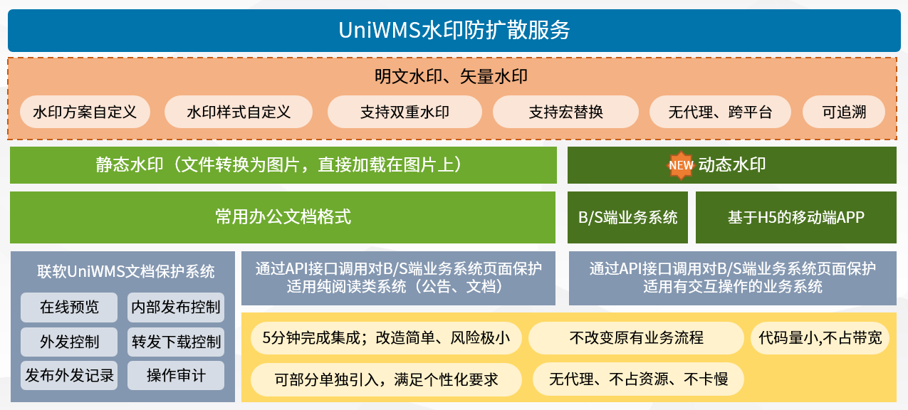 UniWMS是聯軟自主研發的水印防擴散服務,分為有代理和無代理兩種部署方式,今天要給大家介紹的是無代理水印防擴散服務。無代理水印是一種用戶無需安裝客戶端就可以體驗的新型水印技術。